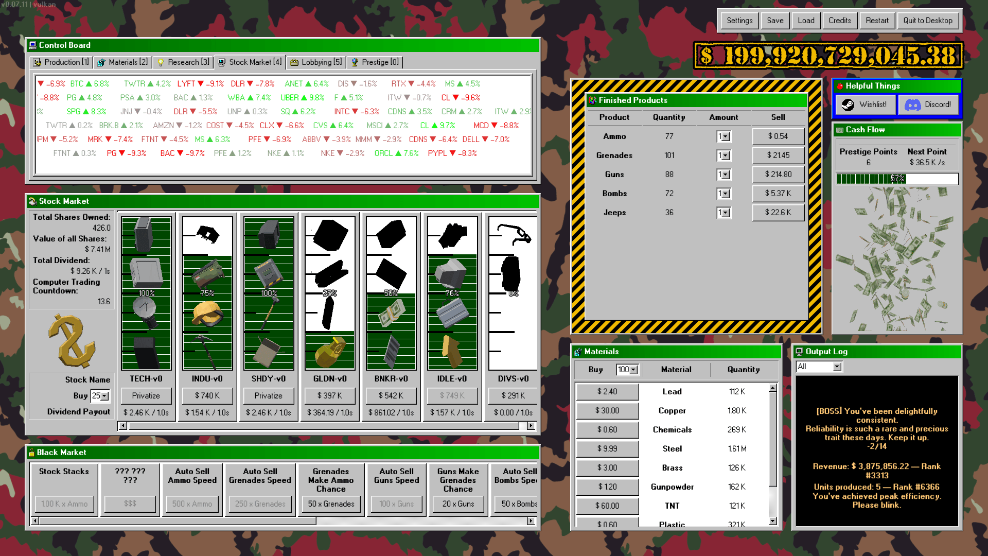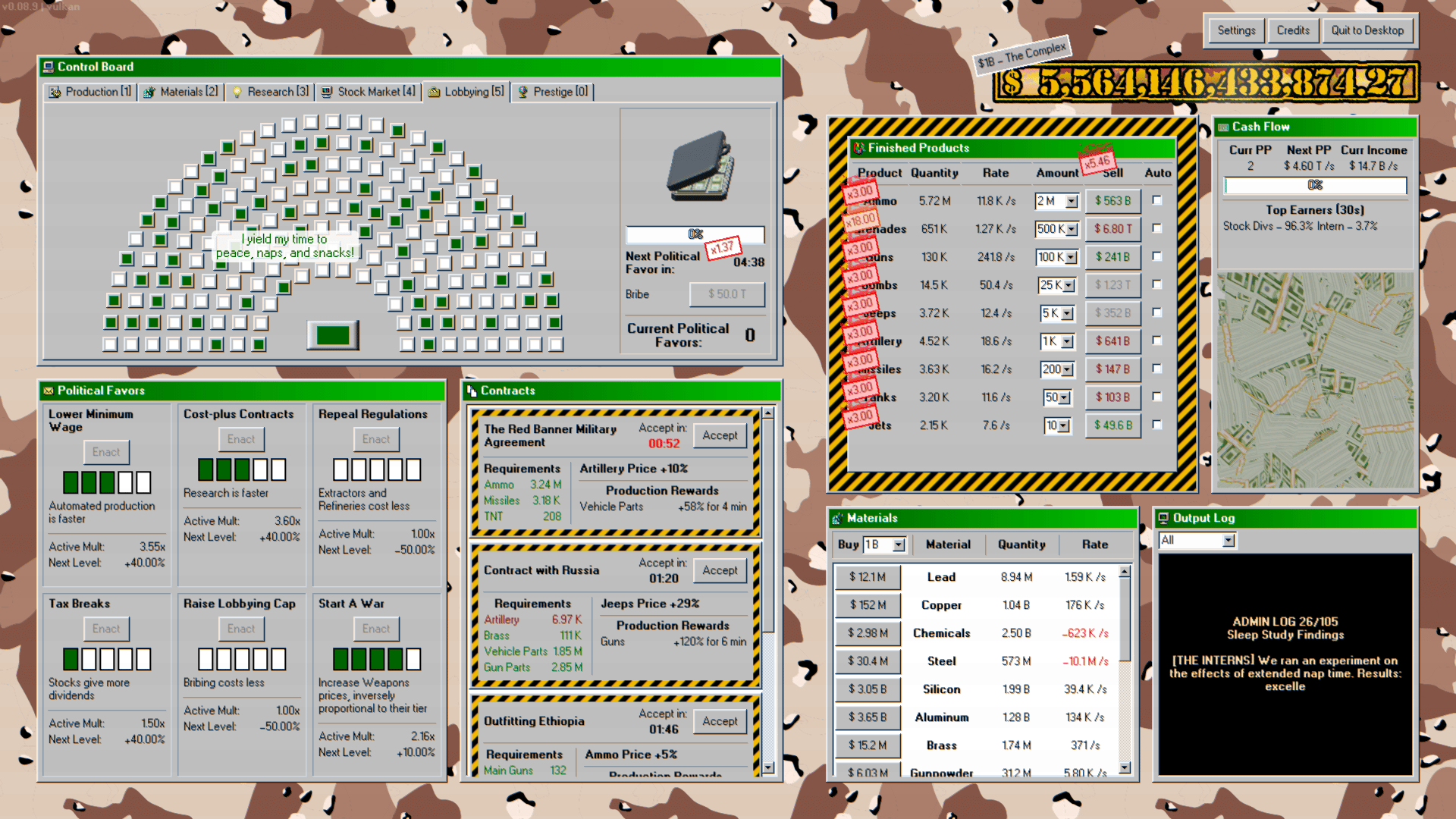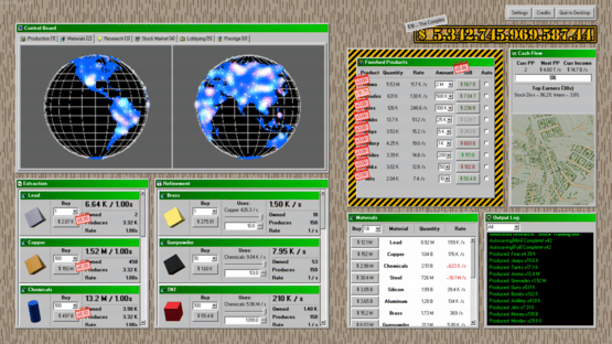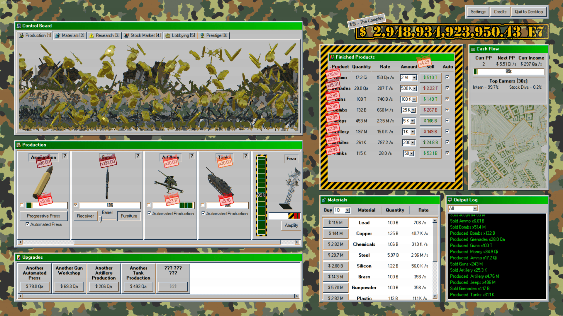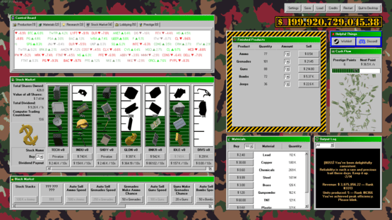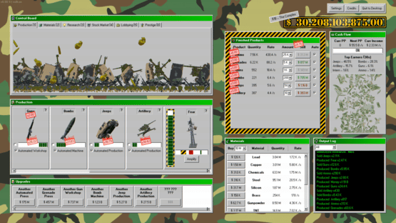 Make weapons, make money. Start your own military industrial complex enterprise! Begin by making bullets by hand, then with machines, then acquire entire factories. Expand into making guns, tanks, planes, and even nukes. Research new products, faster and cheaper ways to make them, and better methods of making money. Enter the stock market to raise capital, buyout rival companies, or perform market manipulation. Lobby the government for fewer regulations, better contracts, and more demand for your products. Turn the entire economy into a weapons making machine, making you ludicrous amounts of money.