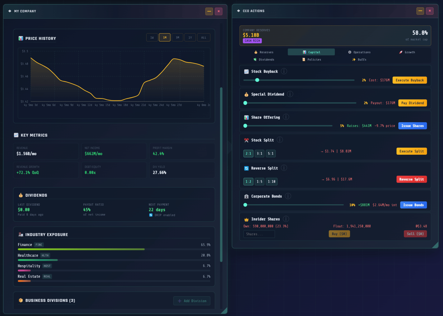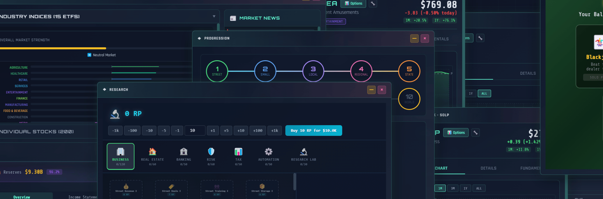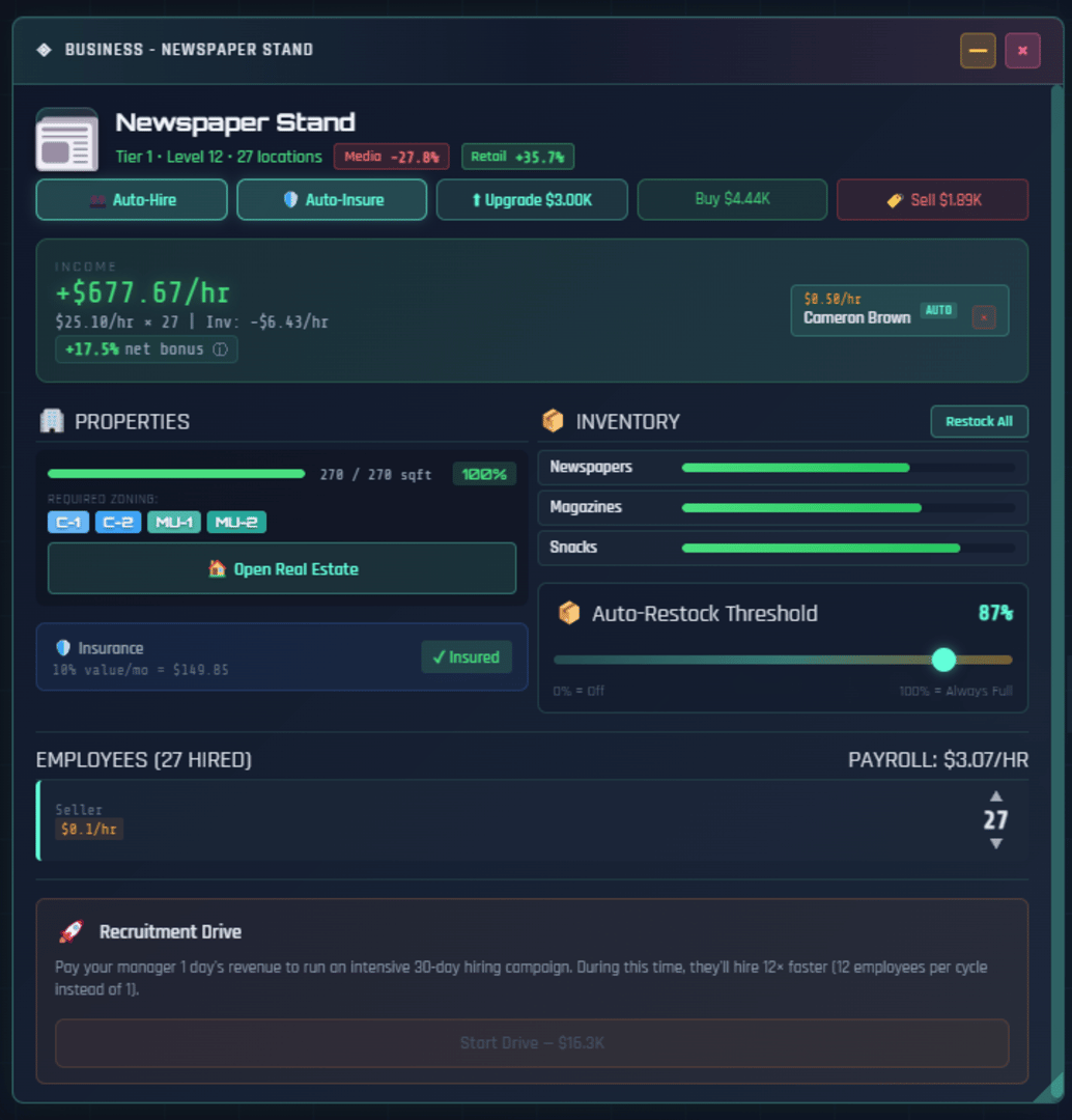 Multiplayer Incremental Idle tycoon with a stock market that actually works. 200 stocks, real options pricing, Fed rate decisions, 55 businesses across 10 tiers, real estate, banking, taxes, and a 530-node research tree. Multiplayer shares one market. There's also a casino.