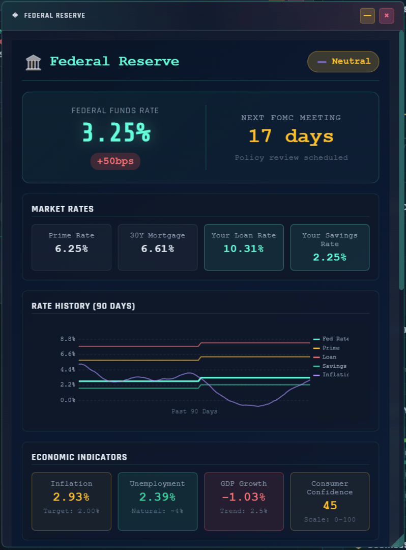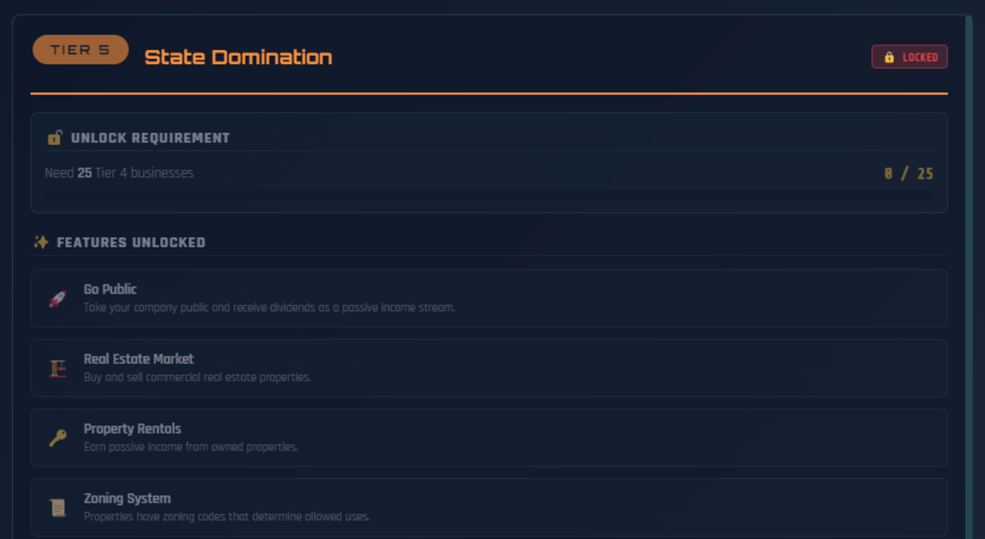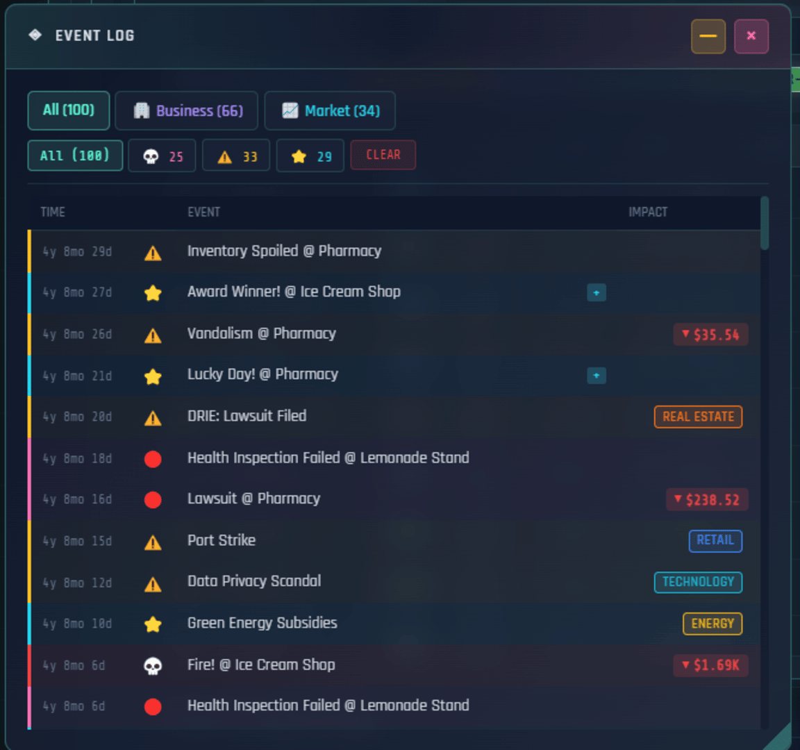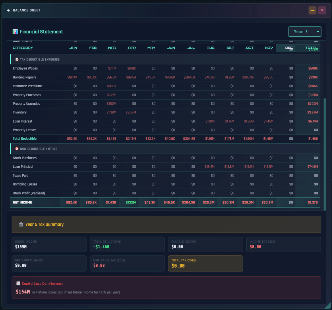 Multiplayer Incremental Idle tycoon with a stock market that actually works. 200 stocks, real options pricing, Fed rate decisions, 55 businesses across 10 tiers, real estate, banking, taxes, and a 530-node research tree. Multiplayer shares one market. There's also a casino.