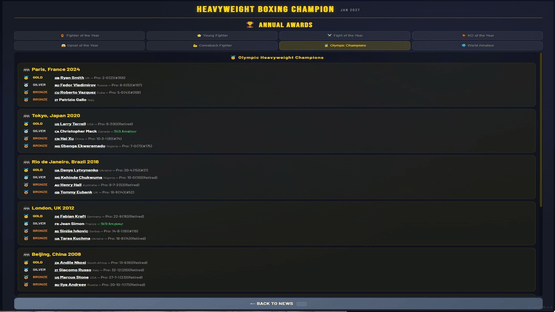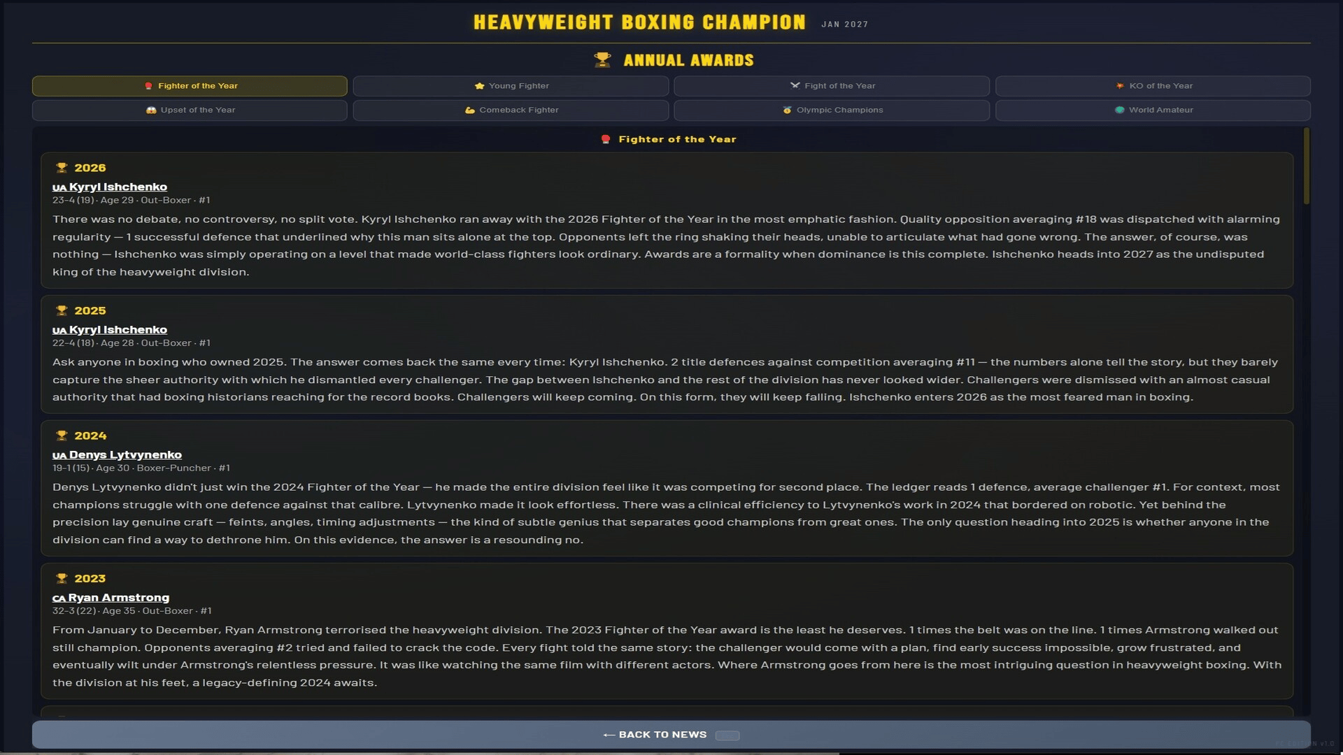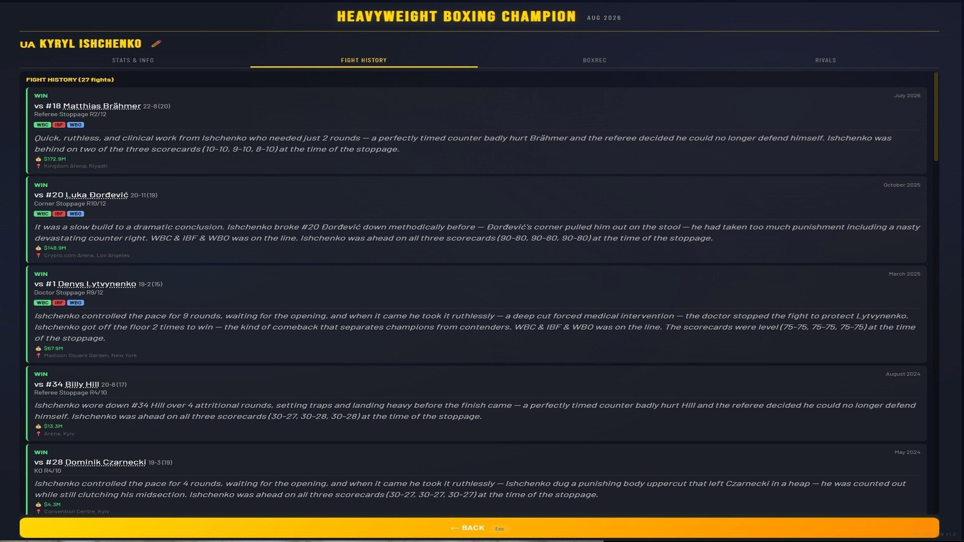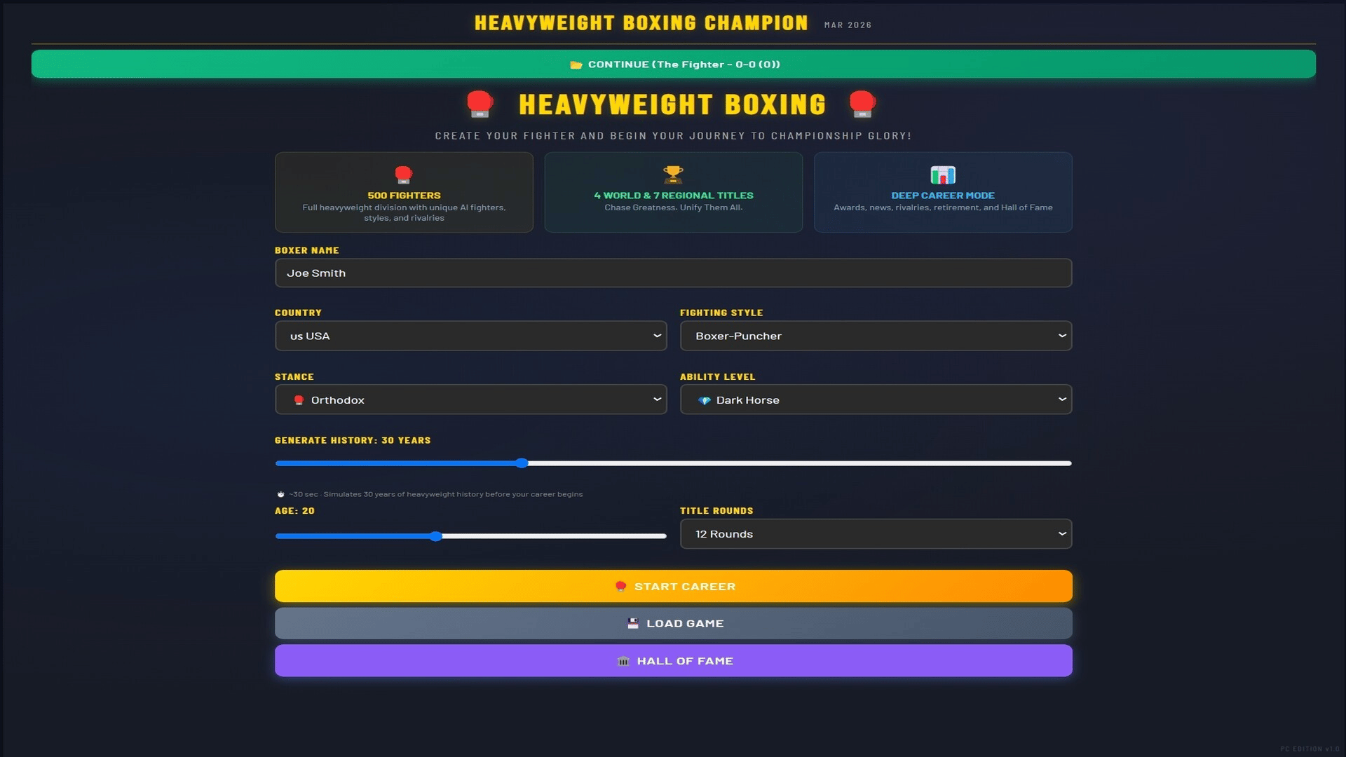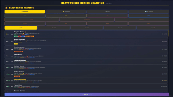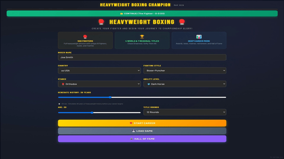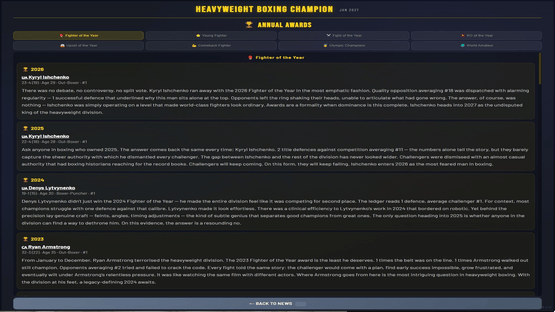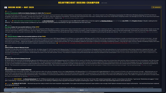 Manage a heavyweight boxer from turning pro to undisputed champion. 500+ fighters, 4 world titles, 7 regional belts, live round-by-round commentary, rivalries, awards, and a deep career mode spanning 1,000+ years. Chase greatness. Unify them all.