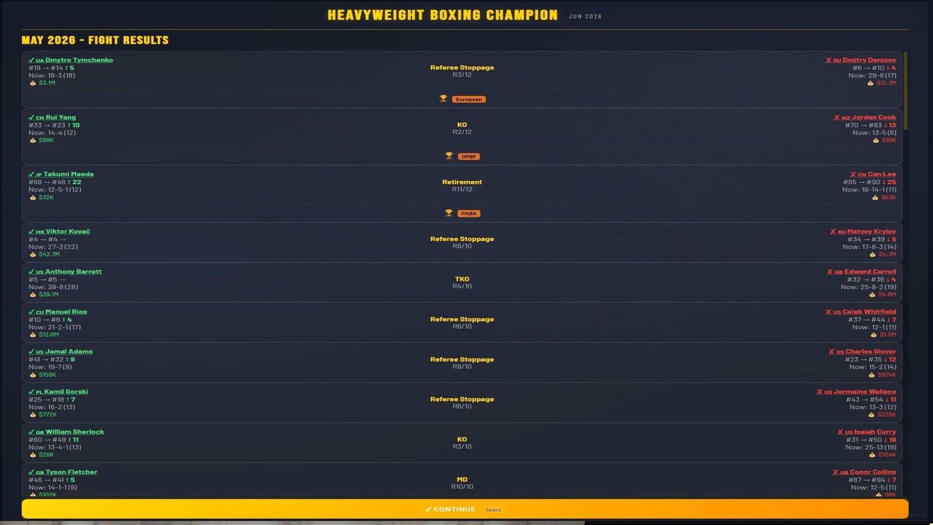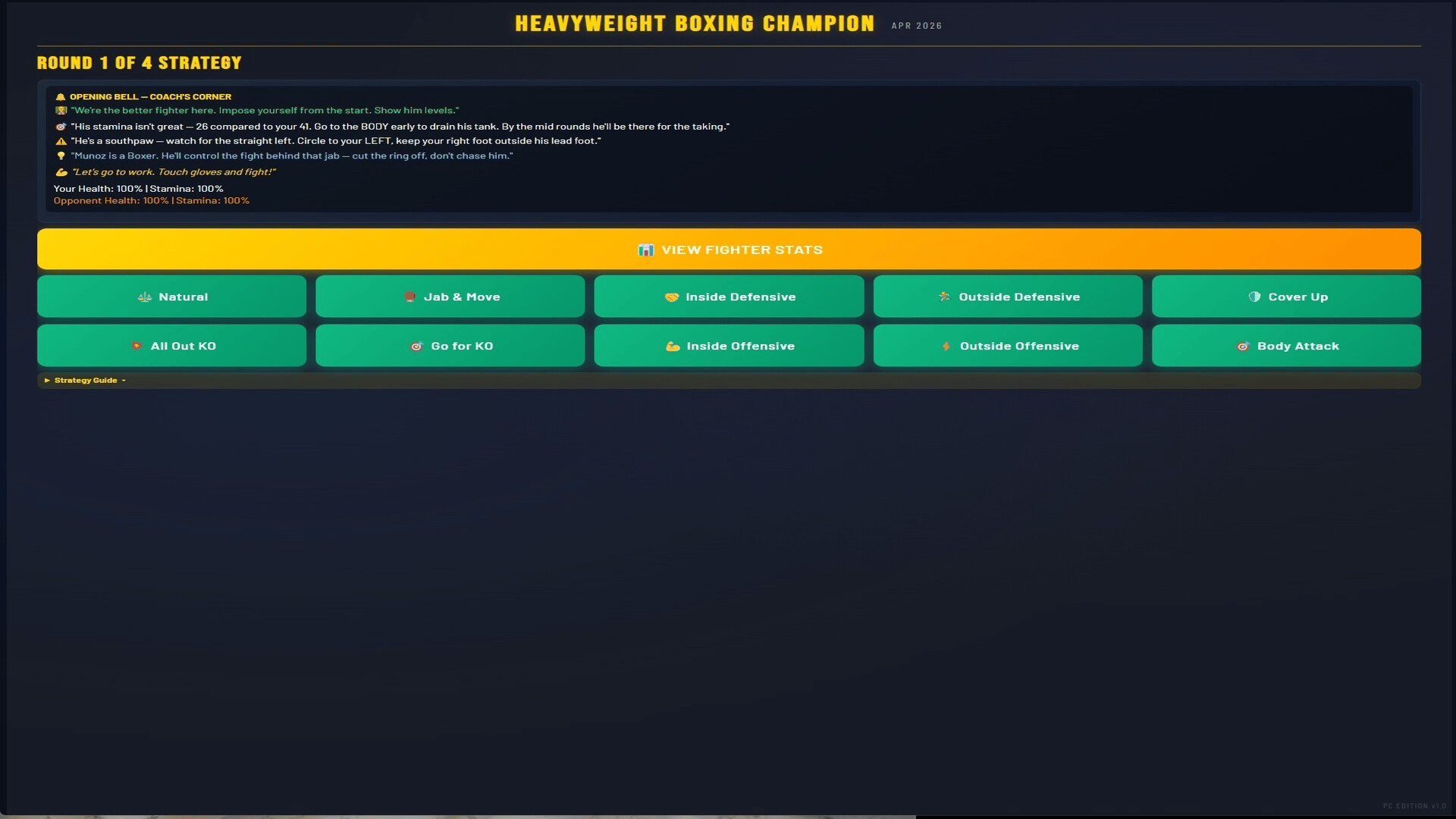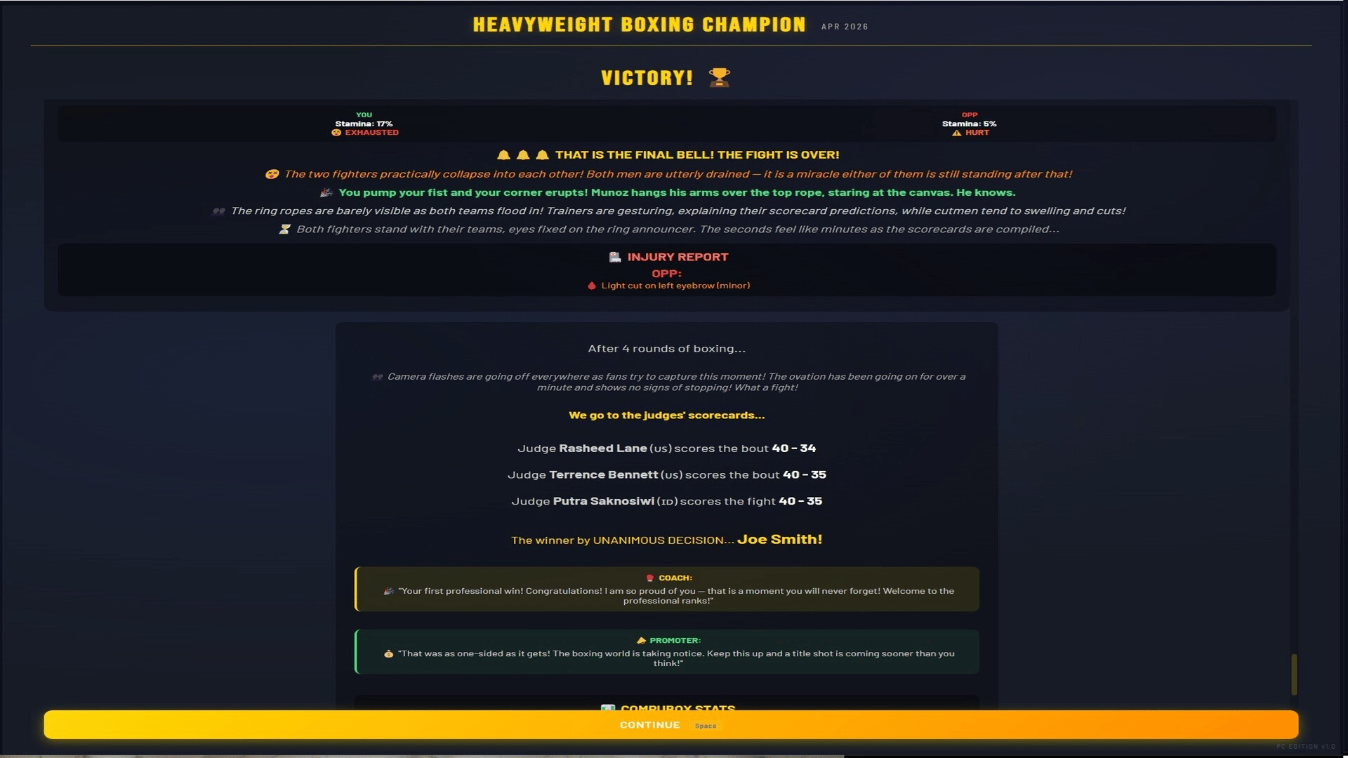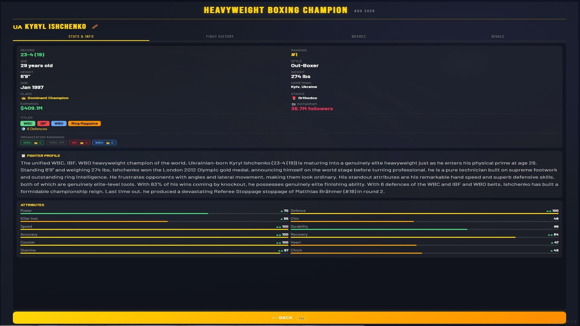 Manage a heavyweight boxer from turning pro to undisputed champion. 500+ fighters, 4 world titles, 7 regional belts, live round-by-round commentary, rivalries, awards, and a deep career mode spanning 1,000+ years. Chase greatness. Unify them all.